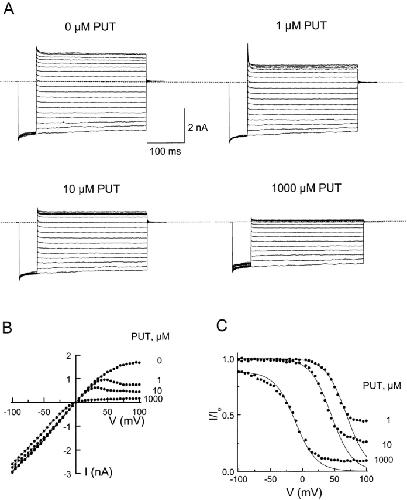 Figure 3. Channel block by intracellular putrescine. (A) Current traces recorded in the absence or presence of various concentrations of putrescine. For each experiment, the membrane voltage was first hyperpolarized to −100 mV for 50 ms, and then stepped to various test voltages from −100 to +100 mV in 5-mV increments for 300 ms. However, for clarity, we only plotted the current traces recorded at 10-mV intervals. (B) I-V curves in the absence or presence of various concentrations of putrescine. (C) The fractions of current not blocked by putrescine are plotted against membrane voltage. The curves were drawn according to the Woodhull equation (Fig. 2). |