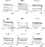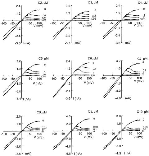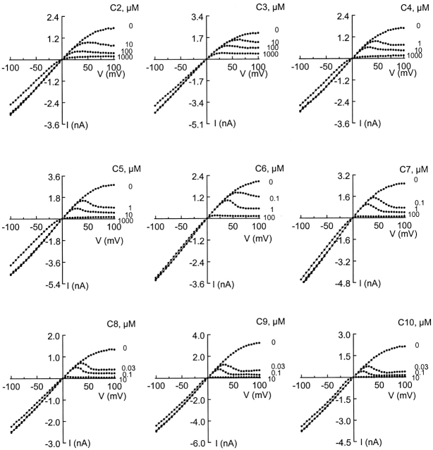 Figure 5. Effects of a series of intracellular diamines on the current–voltage relationship of the IRK1 channel. The I-V curves were obtained in the absence or presence of nine diamines (DMC2 through DMC10, labeled C2 through C10) at the concentrations indicated. |