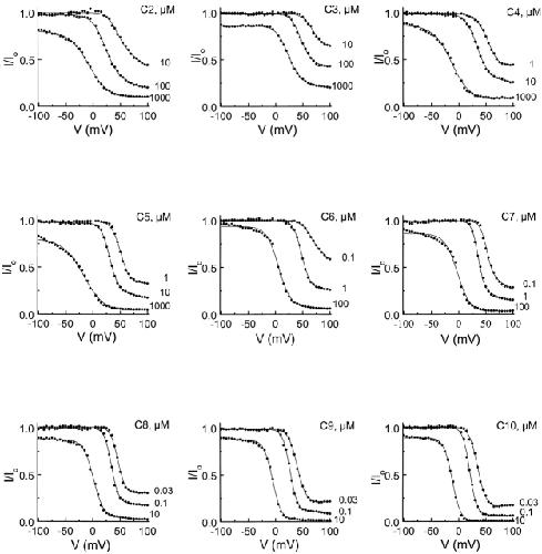 Figure 6. Voltage dependence of channel block by a series of intracellular diamines. The fractions of unblocked current in the presence of various diamines (DMC2 through DMC10, labeled C2 through C10) at the indicated concentrations were plotted as a function of membrane voltage. The curves superimposed on the data are fits of . From each fit, the current at a given voltage was normalized to the value at −100 mV. |