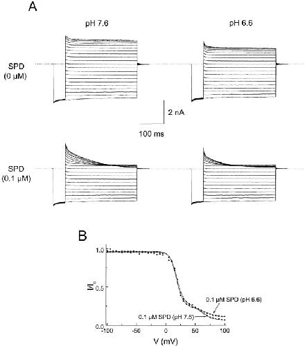 Figure 9. Intracellular pH dependence of IRK1 channel block by intracellular spermidine. (A) Families of current traces at various membrane voltages from −100 to +100 mV. The two sets of current traces (top and bottom) were obtained without and with spermidine, respectively. The two sets of current traces (left and right) were obtained at intracellular pH 7.6 and 6.6, respectively. Extracellular pH was 7.6 in both cases. The voltage protocol was as for Fig. 3. (B) The fractions of unblocked current in the presence of 0.1 μM spermidine at intracellular pH 6.6 and 7.6 are plotted as a function of membrane voltage. The smooth curves were obtained by simultaneously fitting to the two data curves. The values of all parameters obtained from the fit are: Ka1 = 3.7 (±0.4) × 10−6 M, Za1 = 5.0 ± 0.2; ka−2/ka−1 = 2.0 (±0.3) × 10−2, “za−1 + za−2” = 4.8 ± 0.1; Kb1 = 5.0 (±0.1) × 10−5 M, Zb1 = 3.3 ± 0.2; kb−2/kb−1 = 4.1 (± 1.0) × 10−3, “zb−1 + zb−2” = 3.3 ± 0.1; and pKa = 8.1 ± 0.1 (mean ± SEM, n = 3). |