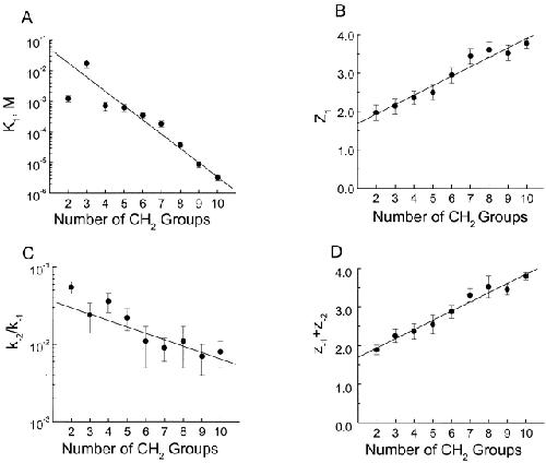 Figure 12. Analysis of channel block by primary diamines of varying methylene chain length. Parameters K1, Z1, k−2/k−1, and “z−1 + z−2” (mean ± SEM, n = 9) are plotted in A–D against the number of methylene groups in each diamine. The parameters were obtained by fitting to the data, as shown in Fig. 6. |