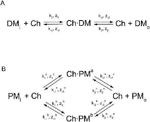 Figure 11. Kinetic schemes for channel block by di- and polyamines. A assumes that a diamine (DM) blocks the channel (Ch) as a permeant blocker. B assumes that a polyamine (PM) blocks the channel (Ch) in two possible conformations, a and b. Parameters kx and zx are the rate constant and apparent valence, respectively, for a given transition. |