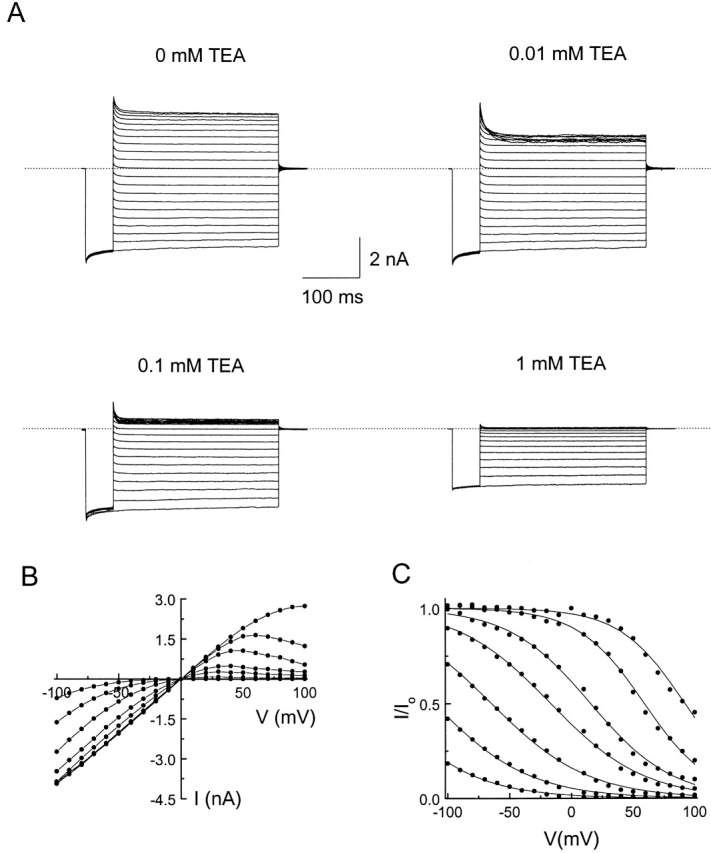 Figure 2. Block of the IRK1 channel by intracellular TEA. (A) Current traces recorded in the absence or presence of various concentrations of TEA. The holding potential was zero. For each experiment, the membrane voltage was first hyperpolarized to −100 mV for 50 ms, and then stepped to various test voltages from −100 to +100 mV, in 10-mV increments, for 300 ms. The dashed lines identify the zero current level. (B) Steady state I-V curves in the absence or presence of TEA at concentrations of 10, 30, 100, and 300 μM, and 1, 3, and 10 mM. The current values were determined at the end of each 300-ms voltage pulse. (C) The fractions of current not blocked by TEA at the seven concentrations in B are plotted as a function of membrane voltage. The curves superimposed on the data are fits of the Woodhull equation, I/Io = 1/(1 + [TEA]/Kde−ZF V/RT) (Woodhull 1973), with Kd = 0.20 ± 0.01 mM and Z = 0.85 ± 0.01 (mean ± SEM, n = 5). |