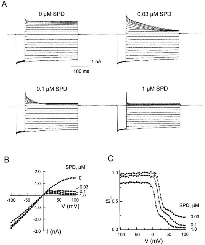 Figure 7. Channel block by intracellular spermidine. (A) Current traces recorded in the absence or presence of various concentrations of spermidine. The voltage protocol was as for Fig. 3. (B) I-V curves in the absence or presence of various concentrations of spermidine. (C) The fractions of current not blocked by spermidine are plotted as a function of membrane voltage. The curves are fits of . For each fit, the current at a given voltage was normalized to the value at −100 mV. The parameters determined from the fits are: Ka1 = 6.7 (±0.6) × 10−6 M, Za1 = 5.0 ± 0.1; ka−2/ka−1 = 3.2 (±0.7) × 10−2, “za−1 + za−2” = 5.1 ± 0.1; Kb1 = 2.9 (±0.3) × 10−5 M, Zb1 = 3.2 ± 0.1; kb−2/kb−1 = 3.0 (±0.6) × 10−3, “zb−1 + zb−2” = 3.4 ± 0.1 (mean ± SEM, n = 9). |