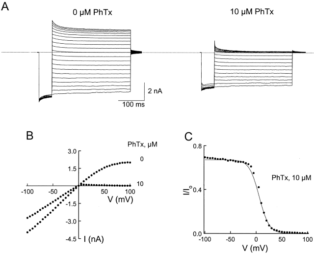 Figure 10. Channel block by intracellular PhTx. (A) Current traces recorded in the absence or presence of 10 μM PhTx. The voltage protocol was as for Fig. 3. (B) I-V curves in the absence or presence of 10 μM PhTx. (C) The fraction of current not blocked by 10 μM PhTx is plotted against membrane voltage. The curve is a fit of the Woodhull equation, I/Io = 1/(1 + [PhTx]/Kde−ZF V/RT). During the fit, the current at a given voltage was normalized to the value at −100 mV. The values of Kd and Z determined from the fits are 21.3 ± 0.4 μM and 2.8 ± 0.1 (mean ± SEM, n = 3), respectively. |