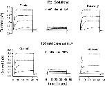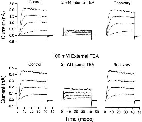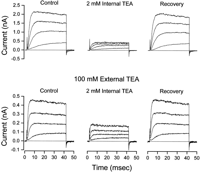 Figure 1. Internal TEA is less effective in the presence of external TEA. (Top) Shaker channel currents at several voltages before, during, and after recovery from application of 2 mM internal TEA with no TEA in the external solution. (Bottom) Currents from another patch before, during, and after recovery from application of 2 mM internal TEA with 100 mM TEA in the external solution. Currents elicited with 40-ms steps to voltages of −30, −10, +10, and +30 mV. |