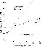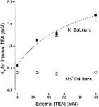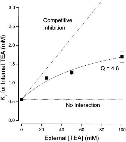 Figure 3. Interaction between external and internal TEA. Ordinate is the apparent dissociation constant for block by internal TEA at the indicated concentrations of external TEA. Error limits illustrated (when larger than symbol) are the estimated errors from the fitting routine (see methods). The dotted line is the expectation for no interaction between internal and external TEA. The dashed line is the expectation for competitive inhibition (). Solid line is the best fit of to the data with a value of Q of 4.6. |