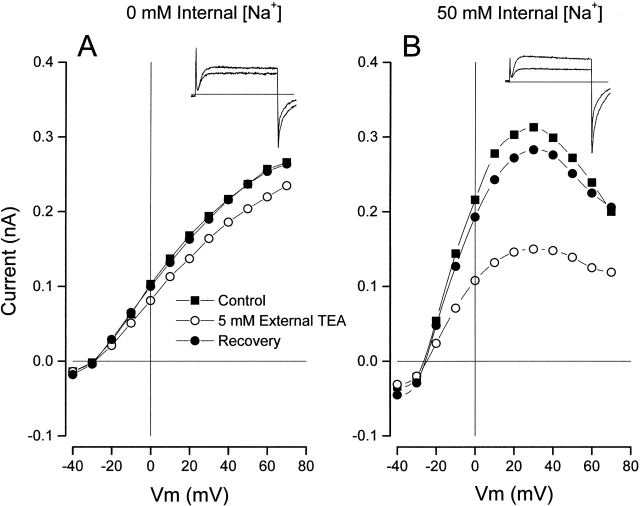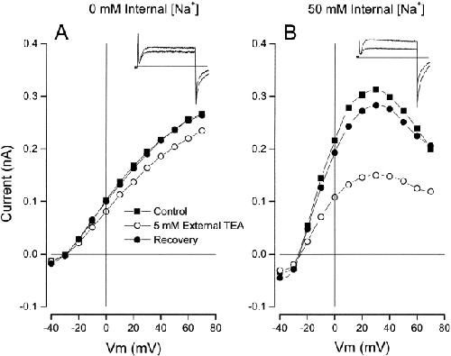 Figure 10. Internal Na+ ions and block by external TEA. (Left) Inset shows Shaker currents (at 0 mV) recorded in the absence (larger) and presence of 5 mM external TEA with an internal solution without Na+ ions. The main figure shows the Shaker channel current–voltage relation recorded before (▪), during (○), and after (•) recovery from application of 5 mM external TEA. Internal solution with 20 mM K+ and NMDG (see methods). (Right) Same as left, but data was recorded in the presence of 50 mM internal Na+ ions (and 20 mM K+). |