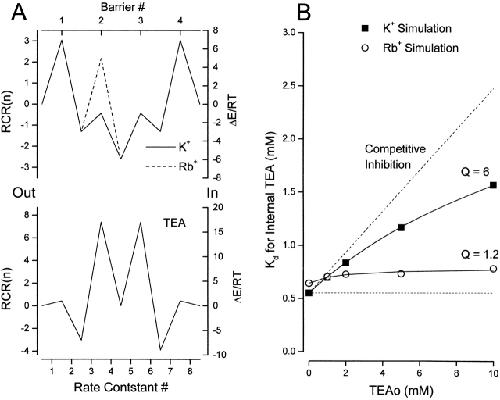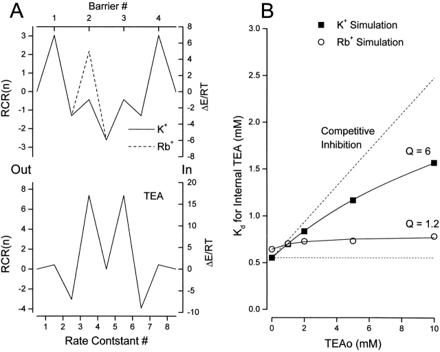 Figure 11. Simulation of apparent antagonism between external and internal TEA. (A, left ordinate) Rate constant representation (RCR, see methods) for (top) K+ (solid line) and Rb+ (dashed line) permeation of the model pore and for TEA block of the pore (bottom). (Right ordinate) Transition energies for the model using a frequency factor of 3 × 1011 s−1. The barrier heights would be three RT larger if the Eyring frequency factor (5.8 × 1012) were used. See text for details. The external solution is on the left side of the energy profiles. (B) Simulation of the apparent Kd for block by internal TEA as a function of the external TEA concentration with the K+ and Rb+ rate constants from A. Solid lines are fits of with the indicated values of Q for simulations with K+ (▪) and Rb+ (○) rate constants. In these simulations, external and internal ion concentrations were 10 and 150 mM, respectively. The size of the simulated current at 0 mV with the K+ ion rate constants was near 1 pA. |