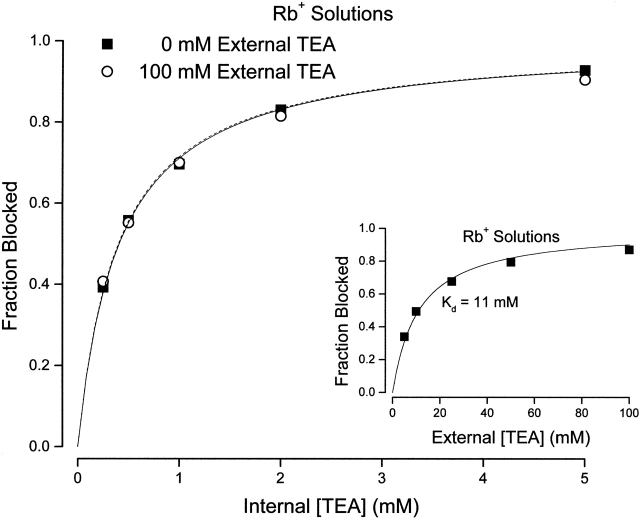 Figure 5. Channel block by internal TEA in the absence and presence of external TEA in Rb+ solutions. Fraction block of Shaker channel current by the indicated internal TEA concentrations in the absence (▪) and presence (○) of 100 mM external TEA. Currents measured at 0 mV. (Dotted line) Fit of to the data in the absence of external TEA with a Kd value of 0.4 mM. (Solid line) Fit of to the data in the presence of 100 mM external TEA with a Kd value of 0.41 mM. Mean values of three to four measurements. All standard error limits were smaller than the symbols. (Inset) Channel block by external TEA in the presence of Rb+ ions. Block of Shaker current at a potential of 0 mV at the indicated concentrations of external TEA. Mean values from three to four measurements. All standard error limits were smaller than the symbols. (Line) Best fit of to the data with the indicated dissociation constant. |