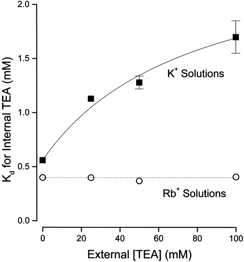 Figure 6. Lack of interaction between external and internal TEA in the presence of Rb+ ions. Ordinate is the apparent dissociation constant for block by internal TEA at the indicated concentrations of external TEA in K+ (▪, from Fig. 3) and Rb+ (○) solutions. Error limits illustrated (when larger than symbol) are the estimated errors from the fitting routine (see methods). Solid line from Fig. 3. Dotted line represents a constant apparent Kd value of 0.4 mM. |