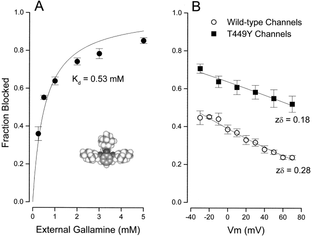 Figure 7. External gallamine block of Shaker K channels. (A) Block of Shaker channels (at 0 mV) by the indicated external gallamine concentration. (Solid line) Fit of to the data with the indicated value of the dissociation constant. Mean and SEM limits from three to five measurements, except as indicated. (Inset) Space-filling model of gallamine. (B) Voltage dependence of channel block by external gallamine. Block of wild-type (○) and T449Y (▪) channels by 0.25 mM external gallamine at the indicated membrane voltages. Lines are fits of to these data with the indicated values of zδ. |
