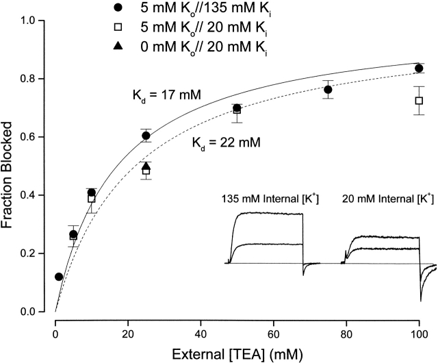 Figure 9. Interaction between external TEA and internal K+ ions. (Inset) Currents (at 0 mV) recorded with 135 mM (left) and 20 mM (right) internal K+ in the absence (larger current) and presence of 25 mM external TEA. (Main figure) Channel block (at 0 mV) at the indicated concentrations of external TEA in 135 mM (•) and 20 mM (□) internal K+. Block by 25 mM TEA was measured (▴) with 20 mM internal K+ and a nominally 0 K+ external solution (see methods). |