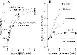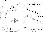 Figure 8. Interaction between external gallamine and internal TEA. (A) Block of Shaker channels (at 0 mV) by the indicated internal TEA concentrations in the absence (•) and presence (□) of 5 mM external gallamine. Lines are fits of to the data with the indicated Kd values. n = 2–5; duplicate values plotted individually, mean values (n = 3–5) with SEM limits only if larger than symbols. (B) Ordinate is the apparent dissociation constant for block by internal TEA at the indicated concentrations of external gallamine. Error limits illustrated (when larger than symbol) are the estimated errors from the fitting routine (see methods). Solid line is the best fit of to the data with a Q value of 2.0. The dashed lines illustrate the predicted effects of an external trivalent, divalent, and monovalent antagonist (see text for details). |