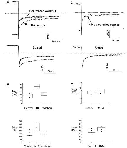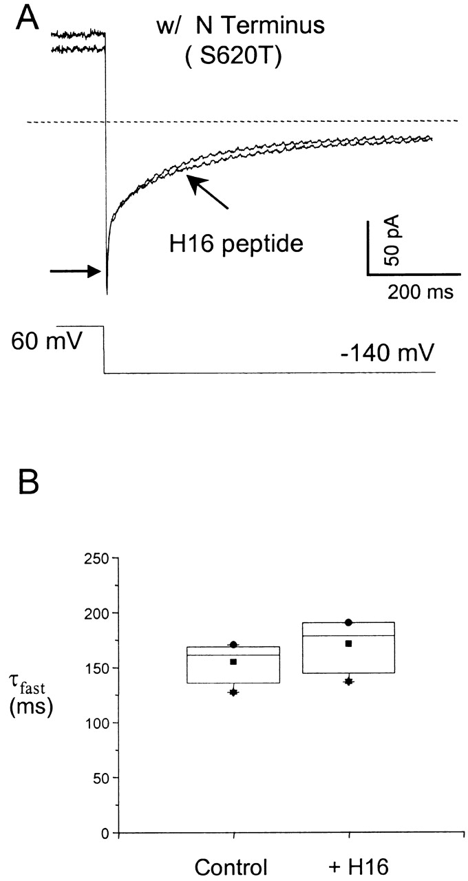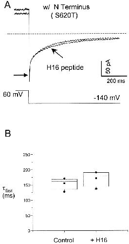 Figure 2. The H16 peptide has no effect on deactivation rate in channels with intact amino termini, indicating that the peptide acts by the same mechanism as the native amino terminus. (A) Tail currents from S620T channels evoked at −140 mV after a voltage step to 60 mV, before and after a 5-min incubation in 1 mM H16 peptide. (Arrow) Initial tail current amplitude. (B) Time constants of dominant fast components of the deactivation extracted from exponential fits to the tail currents were 137.6 ± 16.5 ms, Af = 90.0 ± 2.3% for the controls, and 167.7 ± 21.5 ms, Af = 87.6 ± 4.7% after application of the peptide (n = 3). There is no significant difference when tested with ANOVA. (P > 0.3 at confidence level of 0.05.)