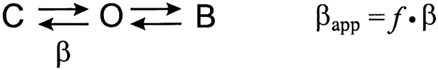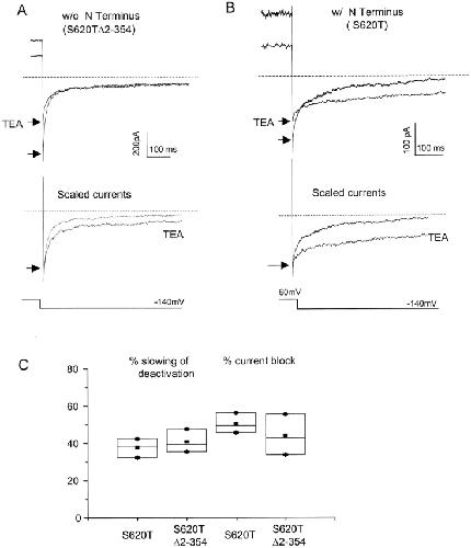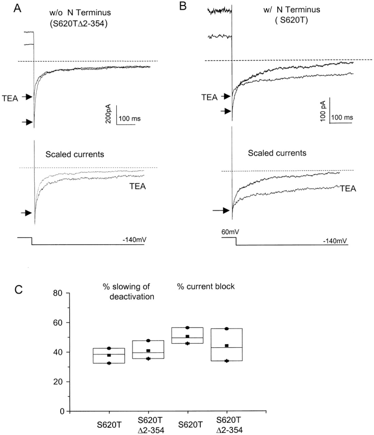 Figure 4. The amino terminus does not alter the ability of TEA to block current or to slow deactivation. (A, top) Tail currents from S620TΔ2-354 truncated channels evoked at −140 mV after depolarization to 60 mV, before and after application of 1 mM TEA to the internal bath solution. Arrows point to the instantaneous tail current levels. (Bottom) The same currents scaled to their peak amplitudes to illustrate the slowing of apparent deactivation rate by TEA. (B, top) Tail currents from channels with amino termini intact under same conditions as in A. (Bottom) The same currents scaled. (C) Box plot shows that mean values for percent slowing of deactivation (left) are predicted by corresponding percent current block (right) for both S620TΔ2-354 truncated channels and S620T channels with intact amino termini, indicating a lack of competition between the amino terminus and TEA in open-channel block (n = 3 for each construct, P > 0.2). The competition models describe a channel that cannot close until the blocking particle vacates its binding site (Scheme I), where C, O, and B are the closed, open, and blocked states, respectively, and β is the rate constant of the open-to-closed transition. SCHEME I Channels in the blocked state are unavailable for closing until they return to the open, unblocked state, and so the apparent deactivation rate βapp is reduced according to the expression βapp = f · β, where f is the fraction of channels in the open state. At the very negative voltages studied, we assume little return from the closed to the open state and βapp ≅ 1/τfast (see methods). The forward and reverse rates of block are assumed to be fast relative to β.