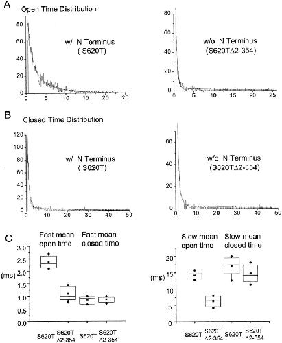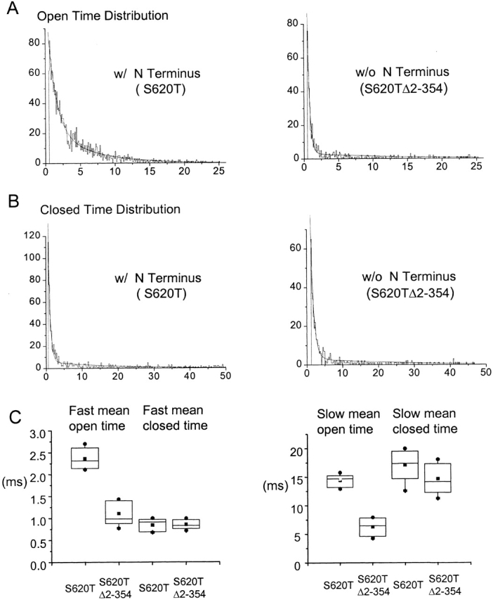 Figure 6. The amino terminus specifically increases the mean open time of the channel. Representative histograms of open- (A) and closed-time (B) distribution for both S620T and S620TΔ2-354 channels are shown with the fitting of the second-order exponential superimposed onto the plot (solid smooth lines). Time constants extracted from the fittings were taken as the mean open and closed dwell time and plotted in C. Both fast and slow mean open times are reduced when the amino terminus are deleted (values are τfast = 2.4 ± 0.2 ms, τslow = 14.4 ± 1.1 ms for S620T channels; τfast = 1.1 ± 0.3 ms, τslow = 6.3 ± 1.7 ms for S620TΔ2-354 channels; n = 3 for each construct, P < 0.01), while the two mean closed times remain unaffected (values are τfast = 0.8 ± 0.1 ms, τslow = 17.1 ± 2.9 ms for S620T channels; τfast = 0.9 ± 0.1 ms, τslow = 14.6 ± 2.7 ms for S620TΔ2-354 channels; n = 3 for each construct, P > 0.3).