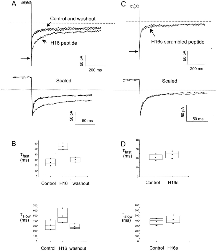 Figure 1. A soluble peptide corresponding to the first 16 amino acids (H16) reversibly restores slow deactivation to HERG channels lacking amino termini. (A) Tail currents from S620T Δ2-354 channels at −140 mV after a 1-s voltage step to 60 mV. (See methods regarding use of the S620T background.) Three current traces are shown, immediately after the patch was excised into the internal bath solution, after a 3-min incubation with 1 mM H16 peptide solution, and after a 5-min washout with peptide-free internal bath solution, respectively. The initial tail current amplitude, indicated by the long arrow, is unaffected by application of the peptide. The bottom panel, with expanded time scale, shows the initial tail current amplitude and includes dotted lines showing the fit with two exponential components. (B) Fast and slow mean time constants of deactivation extracted from exponential fits to the deactivating tail currents as shown in A. Values are τfast = 24.5 ± 6.5 ms, τslow = 309.8 ± 95.4 ms, Af (weight of the amplitude of the fast component represented as a percentage of total current) = 82.0 ± 8.2% for control; τfast = 54.2 ± 5.9 ms, τslow = 488.2 ± 143.5 ms Af = 73.4 ± 9.3% with the added peptide; and τfast = 29.9 ± 4.5 ms, τslow = 280.1 ± 48.3 ms, Af = 75.6 ± 6.9% upon washout of the peptide (n = 4). Using ANOVA (P < 0.01, at confidence interval = 0.05), there is a significant difference between the control and the experiment with peptide applied. (C) Tail currents before and after a 10-min incubation in the scrambled H16s peptide solution. (D) The mean time constants of both fast and slow components of the deactivation was not significantly changed by the scrambled peptide (ANOVA, P > 0.3 at confidence interval = 0.05). Values are τfast = 20.4 ± 2.9 ms, τslow = 381.9 ± 62.0 ms, Af = 89.7 ± 5.5% for control; τfast = 24.0 ± 4.2 ms, τslow = 414.7 ± 68.5 ms, Af = 81.6 ± 7.6% for the scrambled peptide (n = 3).