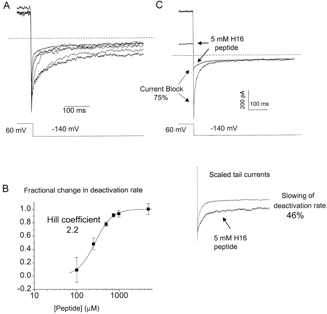 Figure 3. Multiple amino termini are required to slow deactivation in the HERG channel. (A) Tail currents from S620T Δ2-354 channels show progressive slowing in solutions of increasing H16 peptide concentration. From top to bottom, the concentrations are 0, 100, 250, 500, 750, and 1,000 μM. (B) Dose–response curve plotted as a fractional slowing of deactivation rate [Δ(1/τ)/Δ(1/τ)max] against peptide concentration (n = 3 for each peptide concentration up to 1 mM, n = 2 for 5 mM). τ is the time constant of the dominant fast component, which contributes >90% of the deactivating current. Fitting the data to the Hill equation [ln(1 − y)/y] = −N(lnK − ln[peptide]) yielded a Hill coefficient of 2.2 ± 0.1, indicating possible cooperative interactions among at least three amino termini. (C) High concentrations (5 mM) of peptide blocked the current (top), but caused no further slowing of deactivation (scaled currents, bottom).