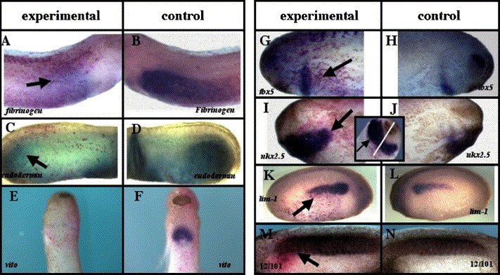 Fig. 1. Activation of Notch signaling using GRSu(H)VP16 increases expression of markers of endodermal cell types and decreases expression of markers of mesodermal cell types. (AâF) Increased expression of endodermal tissue markers (fibrinogen, endodermin, and vito) was observed in embryos injected with mRNAs encoding GRSu(H)VP16 as described in Materials and methods. Activation of the Notch pathway in gastrula stage embryos resulted in an increase of gene expression of the endodermal tissue marker, fibrinogen, on the injected side of embryos (A) when compared to the uninjected control side of embryos (B). (CâD) Similar effects were observed in GRSu(H)VP16-injected embryos examined for another endodermal tissue marker endodermin. Expansion of the normal region of expression of the early ventralmidgut endodermal marker, vito, was observed in GRSu(H)VP16-injected (DEX) embryos (E) when compared to the sibling-injected (no DEX) control stage-matched embryos (F). (GâN) In sharp contrast, expression of mesodermal tissue markers tbx5 (GâH), nkx2.5 (IâJ), lim-1 (KâL), and 12/101 (MâN) decreased or was completely ablated on the injected side of embryos when compared to the uninjected control sides of embryos (or no DEX control embryos, data not shown). In all experiments, mRNAs encoding β-galactosidase were co-injected as a lineage tracer (pink). Embryos were induced with dexamethasone at stages 10â12 and cultured until fixation at stages 22â33. Arrows indicate the injected side of embryos. Most embryos are oriented laterally except panels IâJ that include a ventral image shown in inset and ventral views of embryos shown in panels E and F. The white line denotes the midline of the embryo.
