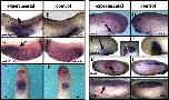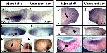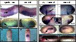 Fig. 5. Prior to morphogenesis, perturbation of Notch signaling during gastrulation modulates endodermal and mesodermal cell types (AâD). All embryos are oriented dorsally. Embryos were injected on one side as described in Materials and methods with mRNA encoding either GRSu(H)VP16 or GRSu(H)DBM, left untreated until stage 10, and then induced with dexamethasone. In all experiments, mRNAs encoding β-galactosidase were co-injected as a lineage tracer (pink). Embryos were induced with dexamethasone at stage 10 and cultured until fixation at stages 16â17 (for mesoderm marker lim-1) or stages 19â20 (for endoderm marker endodermin [edd]). Arrows indicate the injected side of embryos. (A) Ablation of expression of lim-1 was observed in embryos injected with mRNAs encoding GRSu(H)VP16. (B) In sharp contrast, increased expression of lim-1 was observed in GRSu(H)DBM-injected embryos. (C) Activation of the Notch pathway in gastrula stage embryos resulted in an increase of gene expression of the endodermal tissue marker endodermin (edd). (D) The opposite effect was observed in GRSu(H)DBM-injected embryos where a decrease of edd expression was detected.