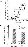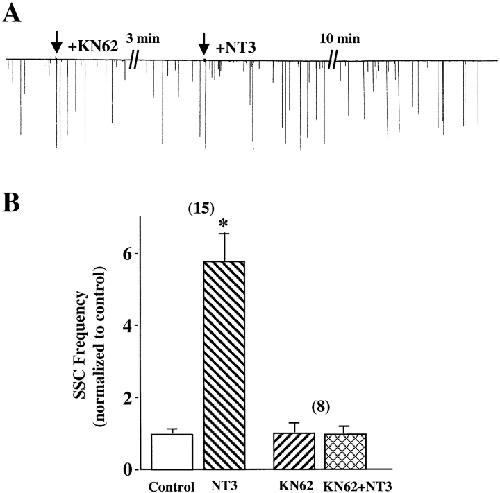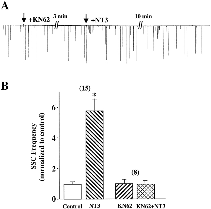 Figure 6. Reversal of NT3 effects by addition of KN62 after NT3 application. (A) Examples showing the time courses that KN62 reverses the NT3 effect. NT3 was first applied (filled arrow) to the culture medium to elicit an increase in the frequency of SSCs. After the SSC frequency reached the peak, KN62 (open arrow) was either applied (open circles) or not applied (filled circles), and synaptic currents were continuously monitored. (B) Summary of the reversal effect of KN62. SSC frequencies are calculated in the same way as Fig. 3 C. n = 5. Asterisk indicates P < 0.01, t test.