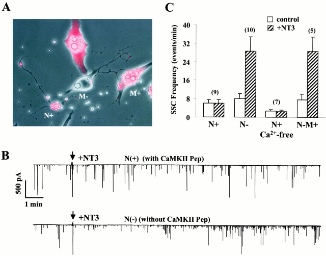 Figure 5. Inhibition of CaMKII prevents the effect of NT3. A peptide inhibitor for CaMKII (CaMKII-pep), together with rhodamine-dextran, was injected into Xenopus embryo at the two-cell stage, and the nerve–muscle co-cultures were prepared from the injected embryos. (A) Super-imposed phase and fluorescence micrographs of the 1-d-old nerve–muscle co-cultures showing cells loaded with (+) or without (−) CaMKII-pep. N, spinal neurons; M, myocytes. (B) A pair of recordings showing that loading of CaMKII peptide into presynaptic neurons N(+) prevented the NT3-induced increase in SSC frequency, whereas NT3 still enhanced transmitter release in a N(−) neuron in the same culture. (C) Summary of the effect of CaMKII-pep loaded into either presynaptic spinal neurons or postsynaptic myocytes. The number of synapses recorded are indicated above each pair of columns. In all N− conditions, application of NT3 elicited a significant increase in SSC frequency (P < 0.01, t test).