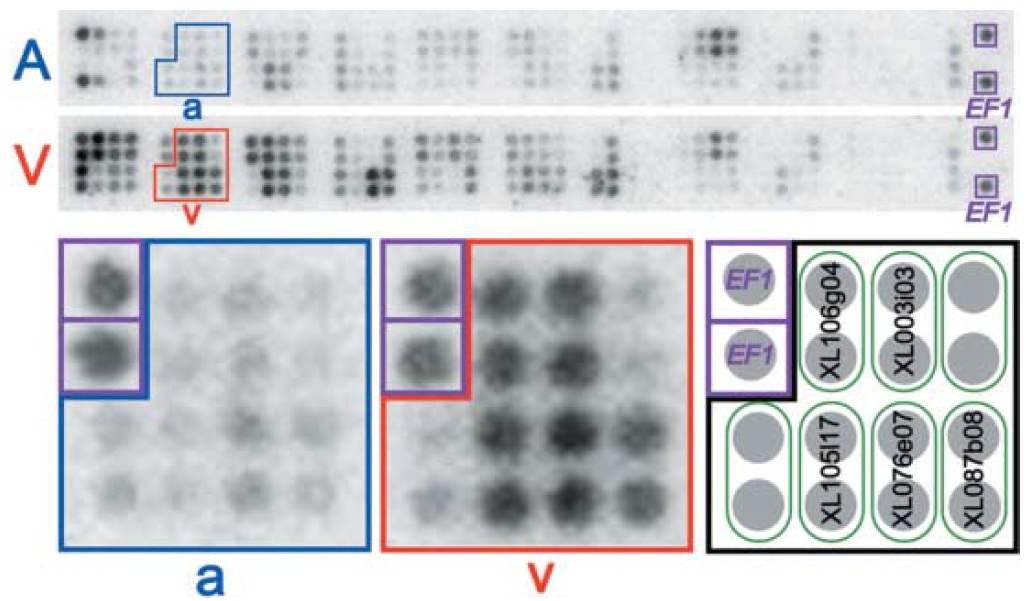 blastomeres was loaded at each membrane (animal, left lane; vegetal, right lane). Fourteen transcripts were abundant in the vegetal