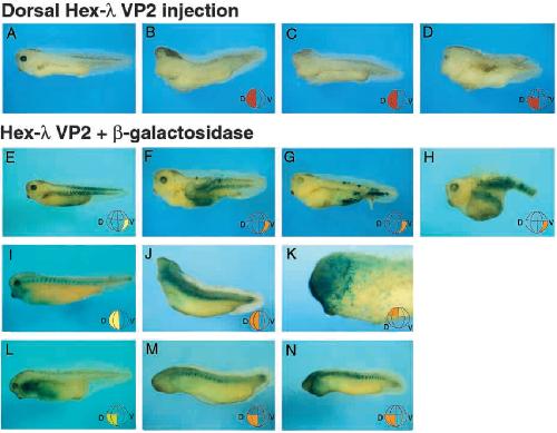 Hex-lVP2 RNA injected into two dorsal blastomeres at the 4-cell stage. (K) b-galactosidase and Hex-lVP2 RNA injected two dorsal animal