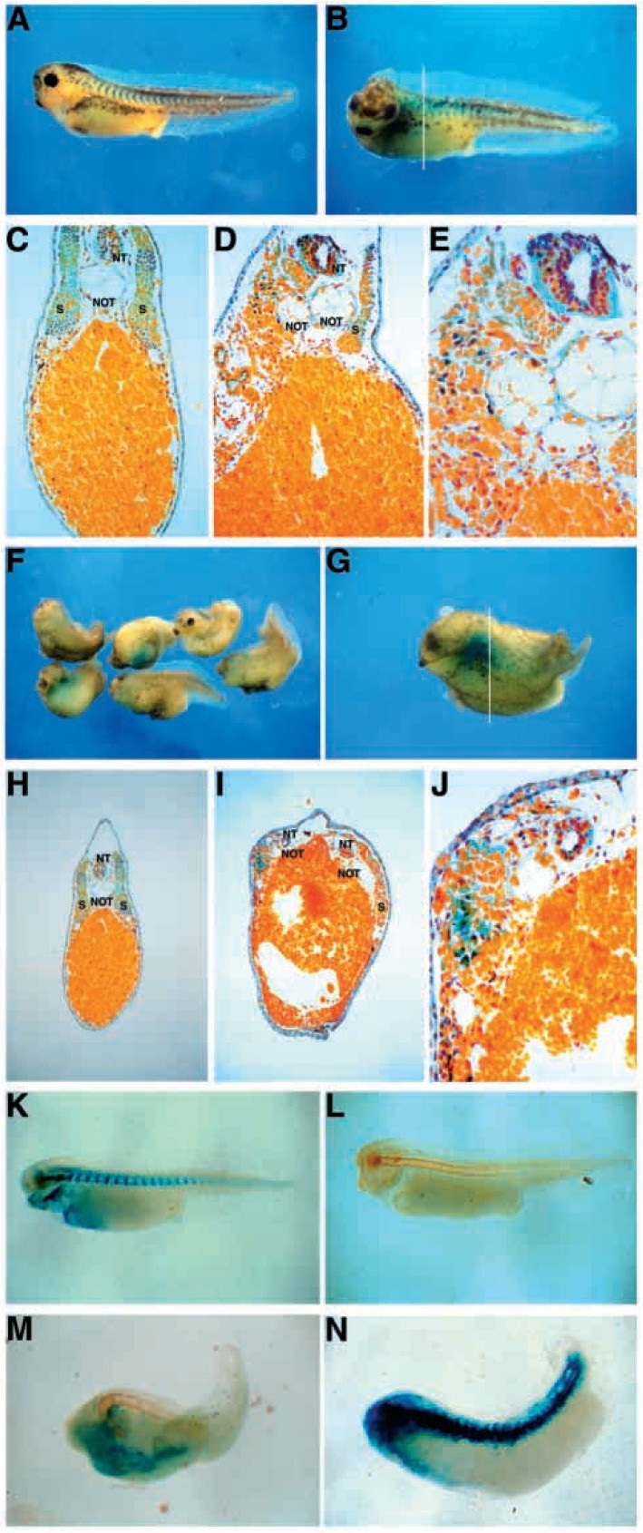 (A) Control embryo at the hindbrain level, (B-E) dorsal injections, (F-G) dorsal-vegetal injection, (H) control embryo, (I-J) ventral-vegetal