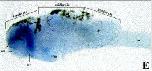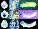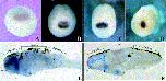 Fig. 3. Expression of Fez in relationship to other anterior genes. Double in situ hybridization at stage 17 detecting Fez (magenta) and mid/hindbrain marker, en2 (turquoise) (A); Fez (magenta) and cement gland marker, Xag1 (dark purple) (D); and Fez (dark blue) and forebrain maker, XBF-1 (turquoise) (G). (B,E,H) Sagittal sections (B,E) and a horizontal section (H) of embryos shown in (A,D,G), respectively. Note the co-expression of Fez and XBF-1 in the prosencephalic region (G,H). (C,F,I) Double in situ hybridization at stage 27 displaying Fez (magenta)+en2 (turquoise) (C); Fez (turquoise)+Xag1 (magenta) (F); and Fez (purple)+XBF-1 (turquoise) (I). Note the expression of XBF-1 in the branchial arch where Fez expression is absent (I).