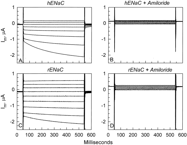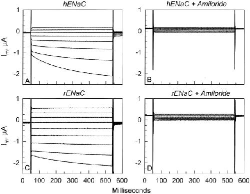 Figure 1. Representative whole-cell currents in oocytes expressing hENaC or rENaC. (A) Oocytes expressing hENaC exhibited an appreciable activation by hyperpolarizing voltages (the most pronounced activation was observed at −100 mV and is the most negative current shown). (B) This voltage-activated current is attributed to hENaC as it is blocked by 10 μM amiloride. (C) By comparison, this activation is markedly reduced in oocytes expressing rENaC. (D) The voltage-activated currents in these oocytes were also amiloride sensitive.