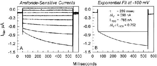 Figure 2. Exponential fit of the voltage-activated current at −100 mV. (A) Whole-cell currents were obtained in the conventional manner by holding at 0 mV and immediately stepping the voltage from −100 to +40 mV in 20-mV increments for a period of ∼500 ms. (B) The current at −100 mV is fitted to a single exponential. The resulting exponential fit is superimposed on the data points. To correct for expression levels, values of ΔIV are normalized by dividing with I −100. In this example, it results in a ratio of 0.752.