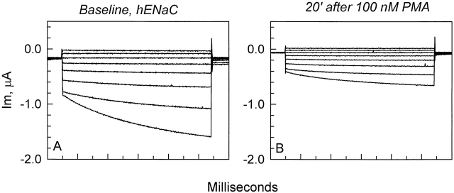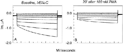 Figure 3. Representative example of the effects of 100 nM PMA on the current in hENaC-expressing oocytes. All currents are subtracted from the residual amiloride-insensitive currents. (A) Currents in the absence of PMA exhibited the voltage activation at hyperpolarizing voltages as described in Fig. 1 and Fig. 2 . (B) PMA caused an inhibition of the current at every voltage. The majority of this inhibition was observed within 15–20 min. Note that 100 nM PMA also inhibited the voltage-activated current described above in Fig. 1 and Fig. 2 .
