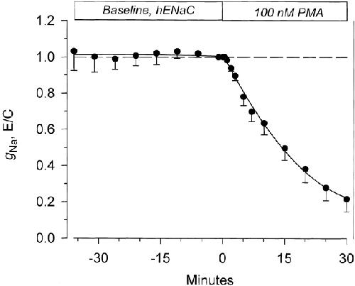 Figure 5. Time course of the effect of 100 nM PMA on the amiloride-sensitive slope conductance in hENaC-expressing oocytes. Amiloride-sensitive currents were calculated by subtracting the small residual currents after the addition of 10 μM amiloride at the end of each experiment. Slope conductance was calculated from the current at the end of the 500-ms pulse between a holding voltage of −100 and −80 mV (see materials and methods). PMA caused a marked decrease of gNa after a delay of ∼1–-2 min. Within 30 min, gNa decreased to ∼22% of baseline. This inhibition was similar to that previously reported for the conductance in rENaC-expressing oocytes ( n = 6).