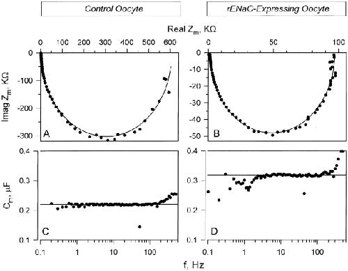 Figure 6. Impedance analysis in control and rENaC-expressing oocytes. (A) Representative example of the impedance in a control oocyte plotted using the Nyquist representation. (B) Example of the impedance in a rENaC-expressing oocyte. Note the difference in the scale. (C and D) The corresponding capacitance in the control and rENaC expressing oocyte, respectively. Similar results were observed in hENaC-expressing oocytes (data not shown). In all cases, the membrane impedance can be well fit with an equivalent circuit of a parallel combination of ideal frequency-independent resistor and capacitor.