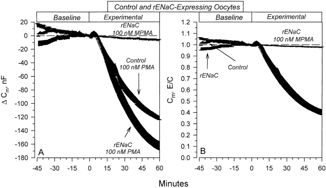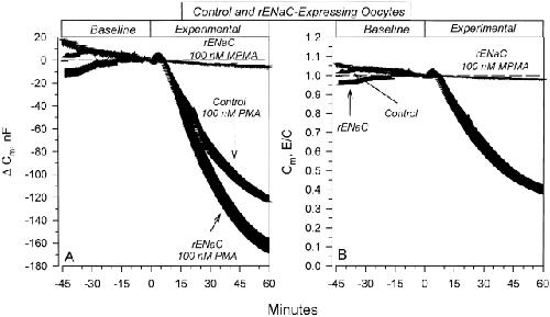 Figure 7. Effects of 100 nM PMA on membrane capacitance. (A) Changes of Cm in control and rENaC-expressing oocytes. Note that the changes of C m were larger in rENaC-expressing oocytes. (B) Changes of C m summarized as E/C (experimental/baseline). Note that the percent change of Cm is the same in control and rENaC-expressing oocytes. This indicates that the baseline Cm is larger in rENaC-expressing oocytes. These effects were specific to PKC activation as the inactive phorbol ester, MPMA, was without effect. n = 7 for rENaC and control oocytes treated with PMA, and n = 5 for rENaC oocytes treated with MPMA.
