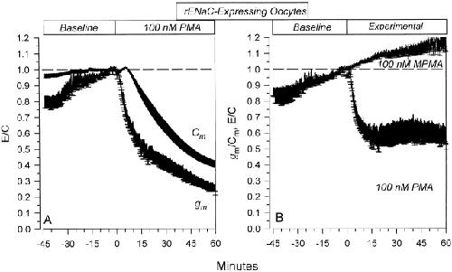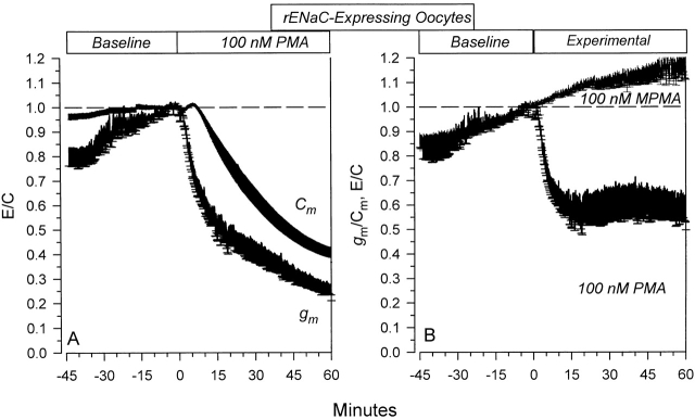 Figure 8. Specific and nonspecific effects of 100 nM PMA on rENaC-expressing oocytes. (A) Time course of the effects of PMA on Cm and g m. The calculated gm represents the membrane slope conductance at 0 mV. Note that the changes of gm preceded the changes of Cm. (B) Data are summarized as specific conductance (gm/Cm). It is clear that PMA causes a rapid decrease of gm/Cm to constant values within 15 min. These effects were not observed with MPMA. n = 7 and 5 for PMA- and MPMA-treated oocytes, respectively.