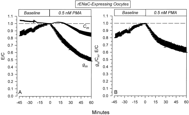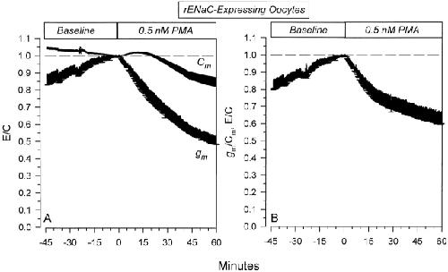 Figure 9. Specific and nonspecific effects of 0.5 nM PMA on rENaC-expressing oocytes. (A) Time course of the effects on Cm and gm . As with 100 nM PMA, the changes of gm preceded those of Cm. (B) Data are summarized as gm/Cm and demonstrate the presence of specific effects of PMA (n = 12).