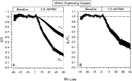 Figure 10. Specific and nonspecific effects of 0.5 nM PMA on hENaC-expressing oocytes. (A) Time course of the effects on Cm and gm . Note that the changes of Cm in this group of oocytes were larger than those observed in rENaC-expressing oocytes. Nevertheless, the changes of gm preceded and exceeded those of Cm, indicating the presence of specific inhibition of hENaC by 0.5 nM PMA. (B) This specific inhibition is clearly evident in the time course of the effects on gm/Cm. These data indicate that the human homolog behaves in a similar manner to the rat homolog. Moreover, hENaC may exhibit a higher sensitivity to inhibition by PMA (n = 5).