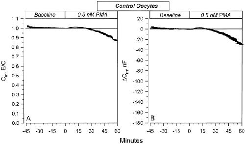Figure 11. Effects of 0.5 nM PMA on the Cm in control oocytes. A small initial transient stimulation of Cm is observed. This corresponded to a 1.5% increase at 13 min and resulted in an average increase of Cm by 3.1 nF. This increase returned to values not different from control at 25 min. The changes of Cm were smaller than those observed in ENaC-expressing oocytes in Fig. 9 and Fig. 10. Thus, activation of PKC by a low concentration of PMA indicates that a component of the effects of PKC on ENaC may involve specific channel trafficking ( n = 10).
