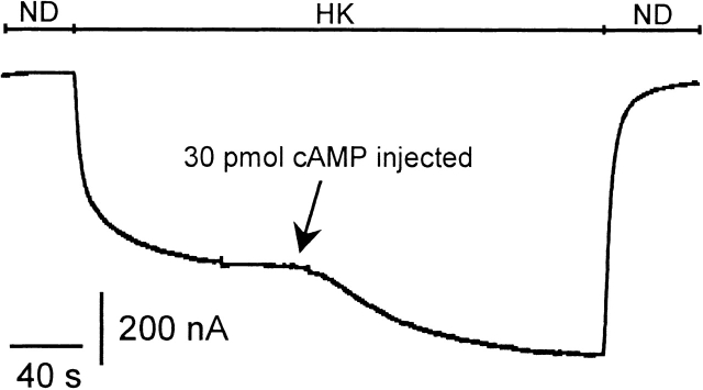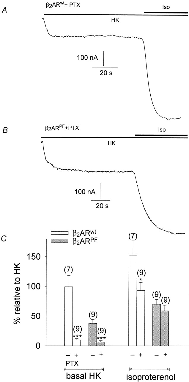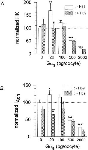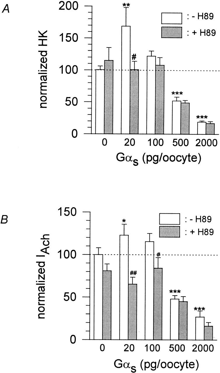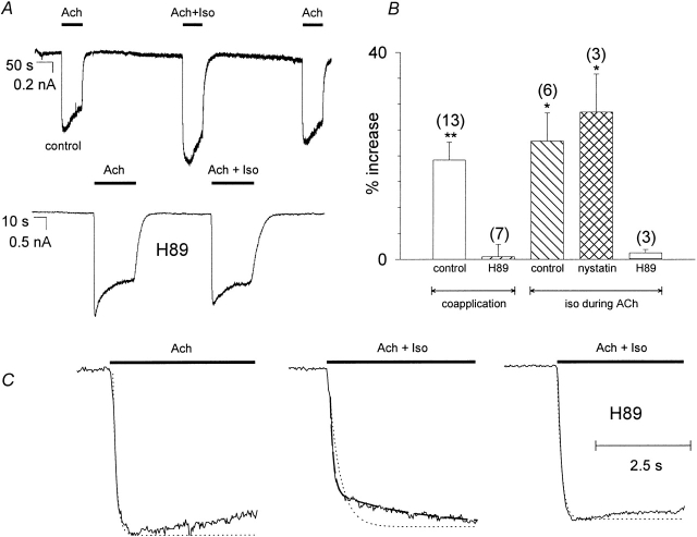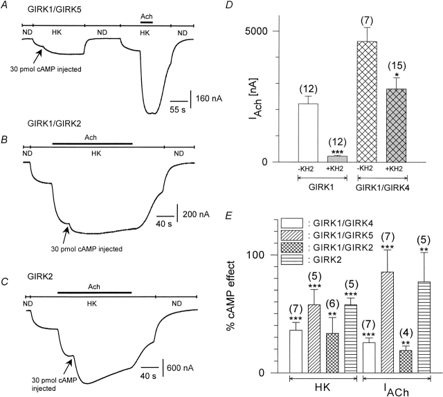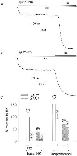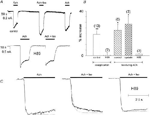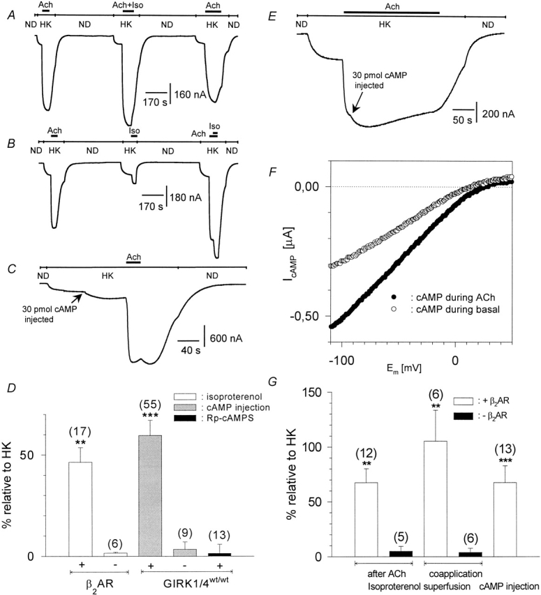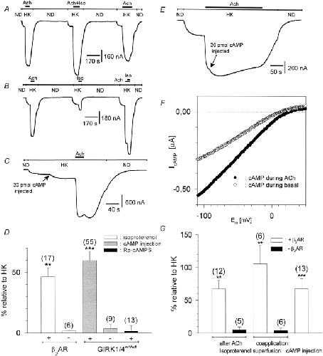 To investigate possible effects of adrenergic stimulation on G protein-activated inwardly rectifying K(+) channels (GIRK), acetylcholine (ACh)-evoked K(+) current, I(KACh), was recorded from adult rat atrial cardiomyocytes using the whole cell patch clamp method and a fast perfusion system. The rise time of I(KACh ) was 0. 4 +/- 0.1 s. When isoproterenol (Iso) was applied simultaneously with ACh, an additional slow component (11.4 +/- 3.0 s) appeared, and the amplitude of the elicited I(KACh) was increased by 22.9 +/- 5.4%. Both the slow component of activation and the current increase caused by Iso were abolished by preincubation in 50 microM H89 (N-[2-((p -bromocinnamyl)amino)ethyl]-5-isoquinolinesulfonamide, a potent inhibitor of PKA). This heterologous facilitation of GIRK current by beta-adrenergic stimulation was further studied in Xenopus laevis oocytes coexpressing beta(2)-adrenergic receptors, m(2 )-receptors, and GIRK1/GIRK4 subunits. Both Iso and ACh elicited GIRK currents in these oocytes. Furthermore, Iso facilitated ACh currents in a way, similar to atrial cells. Cytosolic injection of 30-60 pmol cAMP, but not of Rp-cAMPS (a cAMP analogue that is inhibitory to PKA) mimicked the beta(2)-adrenergic effect. The possibility that the potentiation of GIRK currents was a result of the phosphorylation of the beta-adrenergic receptor (beta(2)AR) by PKA was excluded by using a mutant beta(2)AR in which the residues for PKA-mediated modulation were mutated. Overexpression of the alpha subunit of G proteins (Galpha(s)) led to an increase in basal as well as agonist-induced GIRK1/GIRK4 currents (inhibited by H89). At higher levels of expressed Galpha(s), GIRK currents were inhibited, presumably due to sequestration of the beta/gamma subunit dimer of G protein. GIRK1/GIRK5, GIRK1/GIRK2, and homomeric GIRK2 channels were also regulated by cAMP injections. Mutant GIRK1/GIRK4 channels in which the 40 COOH-terminal amino acids (which contain a strong PKA phosphorylation consensus site) were deleted were also modulated by cAMP injections. Hence, the structural determinant responsible is not located within this region. We conclude that, both in atrial myocytes and in Xenopus oocytes, beta-adrenergic stimulation potentiates the ACh-evoked GIRK channels via a pathway that involves PKA-catalyzed phosphorylation downstream from beta(2)AR.