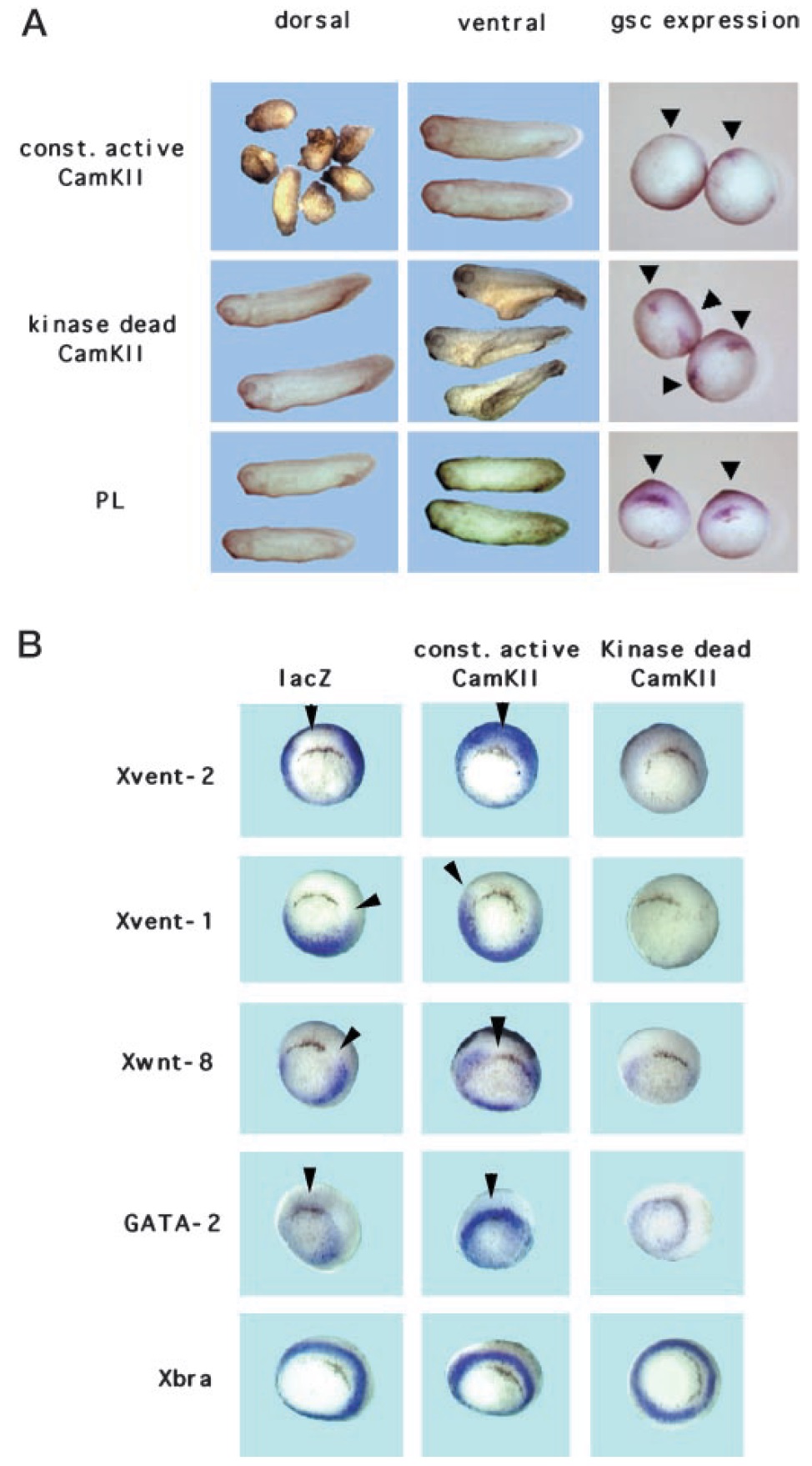 but not dnXwnt-8. Panel B, influence of constitutively active CamKII (CamKII T286D, 1 ng), kinase dead CamKII (CamKII K42M, 1–2 ng),