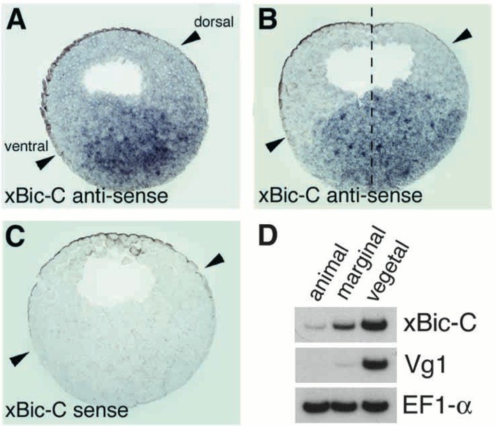 Fig. 4. xBic-C mRNA is displaced towards the dorsal side of the embryo by midblastula. In situ hybridization was performed on sagittal sections of embryos with strong dorsal/ventral polarity at stage 8. (A,B) xBic-C antisense probe, two different embryos are shown. (C) xBic-C sense probe. The arrowheads mark the rotation of the pigment indicating the future dorsoventral axis. While no signal for the xBic-C sense control could be detected, some staining in the animal region was present in the case of xBic-C. Note that the xBic-C signal is stronger in dorsal endoderm than in ventral endoderm. (D) RT-PCR analysis of stage 8 embryos dissected into animal, marginal and vegetal thirds showing that in contrast to Vg1, low levels of xBic-C mRNA can be detected in the animal pole; EF1-α shows equal loading of the RNA. |