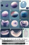 Fig. 3. Expression analysis of x-Bic-C. (A-K) Localization of xBic-C mRNA analyzed by in situ hybridization. (A) Albino oocytes at stages II, III and V. (B) In situ hybridization of a stage V oocyte section, inset shows a magnification of the punctate staining in the oocyte vegetal cortex. Low levels of xBic-C transcripts are found in the animal cytoplasm, but not in the germinal vesicle nucleus. (C) Double in situ hybridization showing vegetal expression of xBic- C and of the germ plasm marker Xcat-2 (Forristall et al., 1995); the arrowhead indicates Xcat-2. Although both genes are localized to the vegetal pole, their distribution is clearly different. (D) Regularly cleaving embryos with a strong dorsoventral polarity at the 4-cell stage. Note the dorsal (light blastomeres) displacement of xBic-C mRNA upon cortical rotation. (E,F) Hemisections of stage 8 and 10.5 embryos on a plane perpendicular to the dorsoventral axis. (G,H) Stage 12 hybridized as a whole mount and as a hemisection; note zygotic expression in the dorsal lip (arrowhead). (I) Stage 24, dorsal view; (J) stage 30, lateral view; staining is seen in the pronephros, the pronephric duct and the posterior spinal cord. (K) Transverse section of a stage 30 embryo showing the staining in the pronephros anlage as well as in the floorplate. (L) RT-PCR analysis of the expression of xBic-C at different developmental stages using ODC as loading control. |
