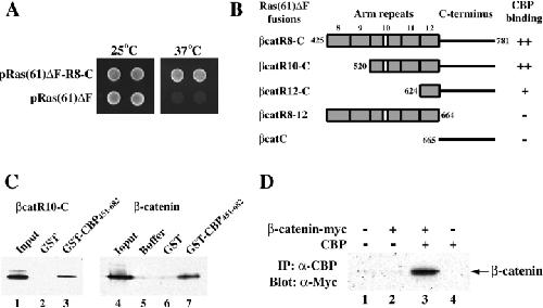 Figure 1. Interaction between β-catenin and CBP. A, Complementation of the cdc25-2 mutation through the interaction of β-catenin COOH-terminal region with CBP. The temperature-sensitive cdc25-2 yeast cells were cotransformed with the indicated plasmids and the CBP expression plasmid isolated in the screening, and incubated on galactose containing plates either at 25 (left) or 37°C (right). B, Fine mapping of the β-catenin domain that binds to CBP in yeast. Cells were cotransformed with the indicated plasmids together with the CBP expression plasmid, and tested for the growth at 37°C as described for A. The numbers indicate the locations in the amino acid sequence of β-catenin. ++, Efficient growth; +, poor growth; â, no growth. C, β-Catenin directly binds to CREB-binding domain of CBP. Bacterially expressed and purified His-tagged βcatR10-C or myc-tagged β-catenin was incubated with buffer (lane 5), GST (lanes 2 and 6), or GST-CBP 451â682 (lanes 3 and 7). After extensive washing, bound proteins were eluted and resolved by SDS-PAGE. βCatR10-C and β-catenin were detected by an anti-His antibody and an anti-myc antibody, respectively. Approximately 10% of the input is shown (lanes 1 and 4). D, Coimmunoprecipitation of CBP and β-catenin. COS7 cells were transfected with expression plasmids for CBP and/or myc-tagged ptβ-catenin as indicated. Cell lysates were immunoprecipitated with anti-CBP polyclonal antibodies 2 d after transfection. The immunoprecipitates were separated by SDS-PAGE and subjected to Western blotting with anti-myc antibodies.