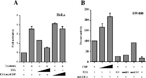 Figure 3. E1A represses β-catenin–mediated transcriptional activation. A, The reporter plasmid pTOPFLASH (1 μg) was transfected into HeLa cells with or without 1 μg of pt β-catenin–encoding plasmid. The expression vector encoding E1A or E1A mutCBP (100 or 500 ng) were cotransfected as indicated. B, SW480 cells were cotransfected with 100 ng of the pTOPFLASH reporter, and increasing amounts (100 or 400 ng) of CBP expression plasmid, 5 ng each of the plasmids encoding E1A WT, E1A mutRB, or E1A mutCBP, or 50 ng of dnLEF-1 expression plasmid as indicated. The activity of the pTOPFLASH reporter in the absence of exogenous CBP, E1A, or dnLEF-1 was set at 100%.