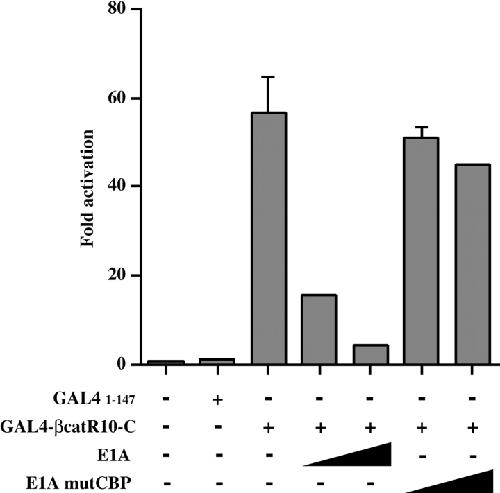 Figure 4. Endogenous CBP is required for transactivation by GAL4-βcatR10-C fusion protein. HeLa cells were transfected with 1 μg of GAL4 reporter construct, pFR-Luc, 50 ng of GAL4 1–147 or GAL4-βcatR10-C, and increasing amounts of E1A or E1A mutCBP expression plasmid (25 or 500 ng) in combinations as indicated.