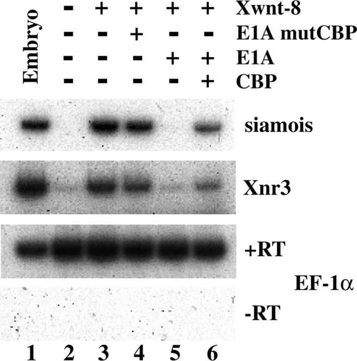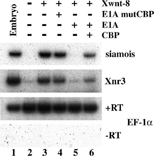 Figure 5. The activation of endogenous Wnt-responsive genes is sensitive to E1A. Both blastomeres of two-cell stage Xenopus embryos were injected with 20 pg of Xwnt-8, 0.5 ng of E1A mutCBP, or E1A, and 3.2 ng of CBP RNAs as indicated. Animal cap explants were dissected at stage 8 to 9 and analyzed for gene expression by RT-PCR.