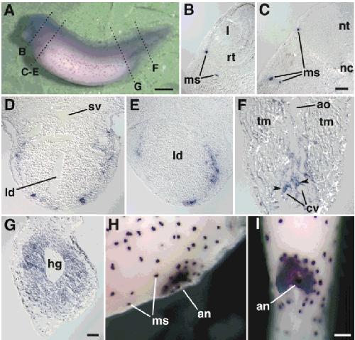 Fig. 2. Embryonic expression patterns of Xenopus gelatinase B (Xmmp-9), revealed by digoxygenin-labeled RNA in situ hybridization. A: Lateral view of a stage 26 embryo showing the first detectable Xmmp-9 expression in scattered mesenchymal cells. B: Increased expression in a stage 37 embryo (black arrowhead points to expression associated with the developing liver diverticulum ). C: High magnification view of the tail of a stage 40 larva. D: Stage 42 larvae showing continued expression in the abdominal region and the tail. Faint staining in the head and in the olfactory epithelium is an artifact, which is sometimes seen in sense RNA controls. E: Stage 46 embryo showing decreased expression of Xmmp-9. A small number of pigmented xanthophores (xn), in the head, dorsal tail, and peritoneum normally appear in albino larvae at this stage, which are not expressing Xmmp-9. F: Negative control stage 38 embryo reveals no appreciable hybridization of sense RNA. All specimens are shown as lateral views with the anterior ends located to the left. cv, caudal veins; ey, eye; ms, mesenchyme cells. Scale bar =500 um in A,B and D and 250uminC.